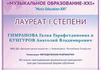 Преподаватели Детской школы искусств Гимранова Галия Гарафетдиновна и Кунгуров Анатолий Владимирович стали лауреатами первой степени Международного конкурса научных, учебно-методических и творческо-педагогических проектов "Музыкальное образование-XXI". В составе жюри конкурса были профессора Московской консерватории и Российского государственного педагогического университета им А.И. Герцена. Победа преподавателей #основноезданиеМира45 в столь престижном конкурсе свидетельствует об их профессионализме и мастерстве. Желаем Галие Гарафетдиновне и Анатолию Владимировичу новых творческих успехов и достижений