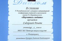 Учащаяся отделения "Музыкальное искусство" Сидорова Рената (преподаватель Анатолий Кунгуров) стала лауретом II степени V Республиканской историко-литературной конференции учителей и школьников имени Е.А.Боратынского "Научитесь любить". Поздравляем Ренату и ее преподавателя Анатолия Владимировича с очередной победой!