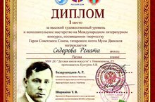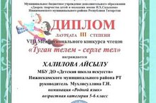 Дипломом лауреата III степени в номинации «Родной язык» награждена воспитанница структурного подразделения на базе гимназии 2 Халилова Айсылу (преподаватель Мухлисуллина Г.Н.) -
