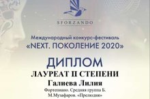 Несмотря на сложившуюся обстановку, наши воспитанники продолжают активно участвовать в различных конкурсах. Лилия Г., учащаяся отделения " Музыкальное искусство" структурного подразделения на базе гимназии 2 ( класс преподавателя Ягафаровой А.Г.), награждена кубком и дипломом Лауреата II степени Международного конкурса- фестиваля "NEXT. Поколение 2020", номинация фортепиано " Лучшее произведение татарского композитора", г. Казань. Конкурс - фестиваль состоялся в традиционном для сегодняшнего дня дистанционном формате. Поздравляем, гордимся и желаем Лилее дальнейших творческих успехов!