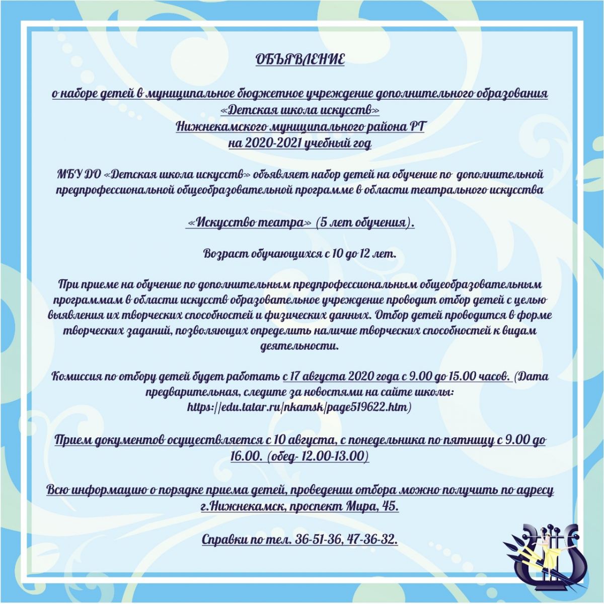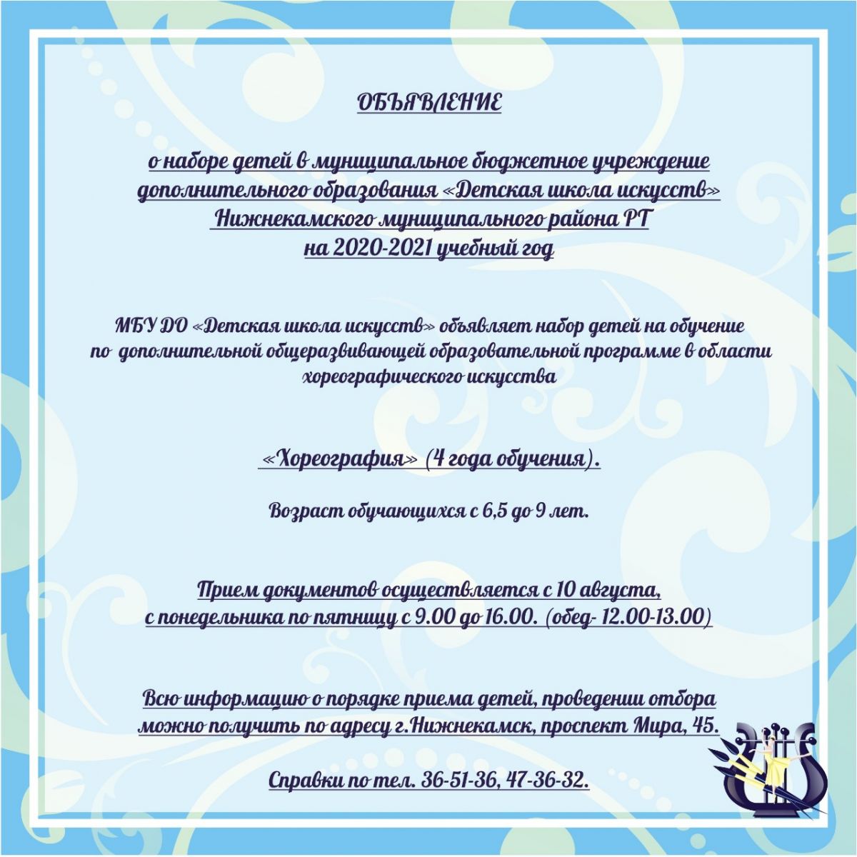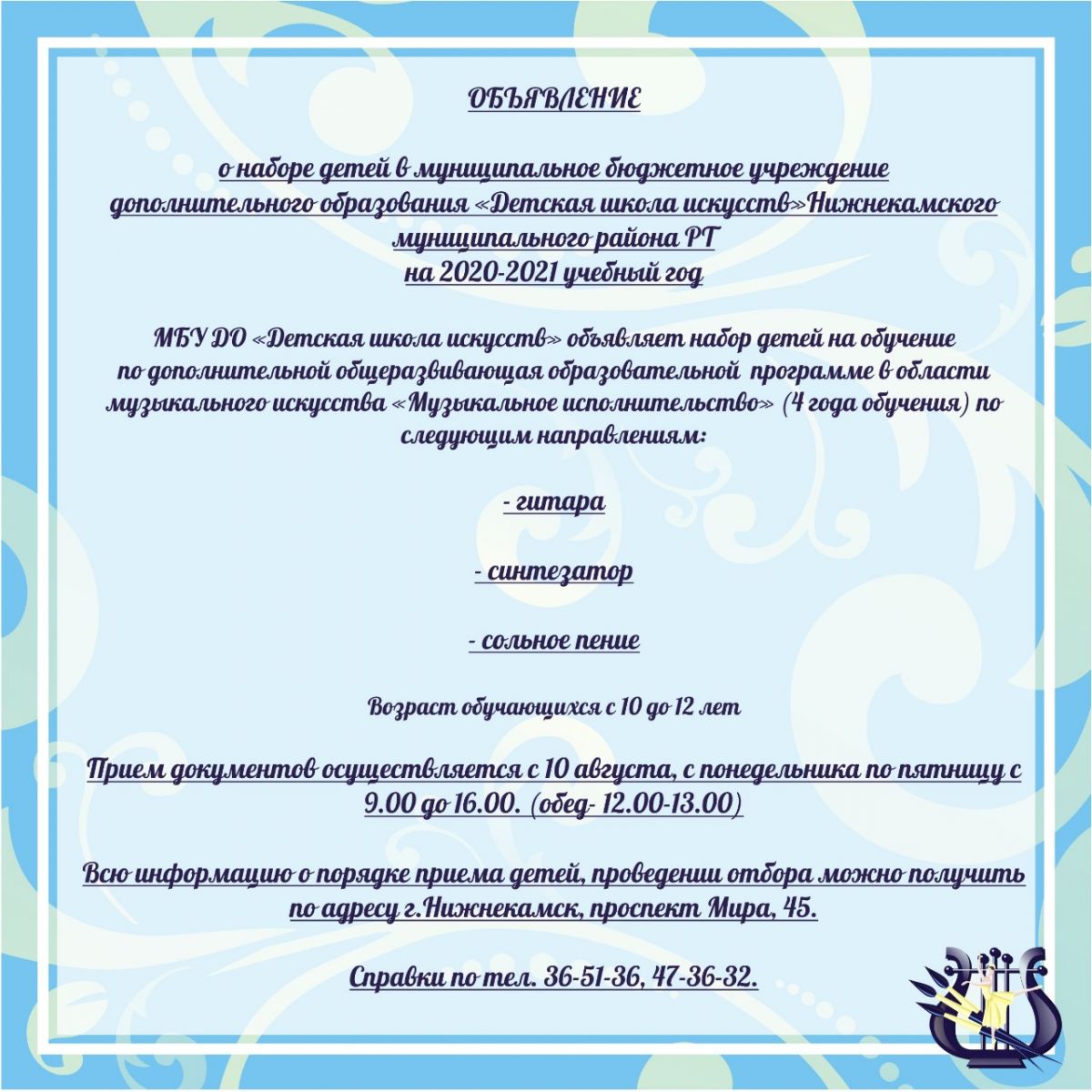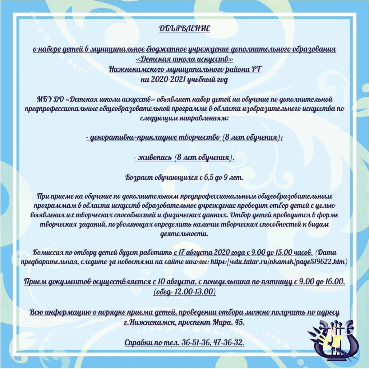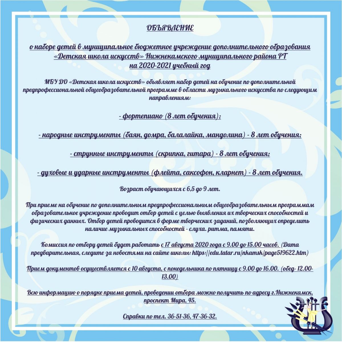Объявления о наборе учащихся на 2020-2021 учебный год