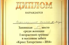 18.09.2014г. состоялся массовый забег «Кросс Татарстана - 2014г.». В легкоатлетическом забеге участвовали все предприятия пгт Камские Поляны. Честь детского сада «Айгуль» защищали Ахметшина А.Ф., Шакирова С.Г., Гафиятуллина У.Р. Гафиятуллина Ульяна Рузильевна заняла 1 место среди женщин награждена Дипломом за подписью Главы МО пгт Камские Поляны А.А.Павлова. Молодцы! Так держать! 21.09.2014