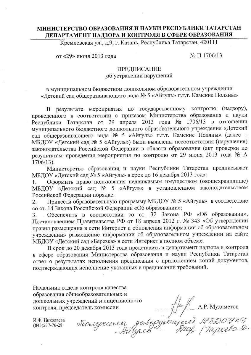 Предписание Министерства образования и науки РТ департамент надзора и контроля в сфере образования