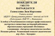 Поздравляем учителя-логопеда Галимуллину Лилю Марселевну с 3 местом в республиканском конкурсе профессионального мастерства и личностных достижений работников образовательных учреждений "Потенциал" в номинации "Авторское дидактические пособие" с развивающим комплектом дидактические игр "Лего-Звукарик". Поздравляем!!!