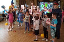 В гости к детям пришёл Незнайка. Вместе с инспектором ДПС дети научили Незнайку правилам дорожного движения, как нужно переходить дорогу. Дети читали стихи,показали инсценировку, поиграли в игры. На мероприятии присутствовали и малыши,которые с удовольствием выучили три цвета светофора.