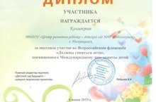 1 июня 2015 года дружный коллектив малышей, сотрудников и родителей детского сада участвовал во Всероссийском флешмобе "Должны смеяться дети", посвященного Международному Дню защиты детей, организованного издательством журнала "Детский сад будущего - галерея творческих проектов" при поддержке Российского фонда развития образования "Сообщество" и получил ДИПЛОМ участника и бесплатную подписку на журнал "Детский сад будущего-галерея творческих проектов" на 2016 год. Интересные идеи для работы наших педагогов, новости в образовании, конкурсы для наших детей, инновационные проекты - это предлагает журнал! СПАСИБО всем, кто принял участие! Мы молодцы! УРА!!!!