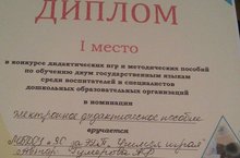 Поздравляем Гумерову Альбину Рафисовну. Она заняла первое место в конкурсе дидактических игр и методических пособий по обучению двум государственным языкам среди воспитателей и специалистов дошкольных образовательных учреждений.