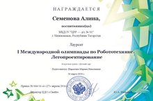 28 апреля были подведены итоги I Международной олимпиады по Робототехнике. Легопроектирование. В этой олимпиаде принимала участие воспитанница подготовительной к школе группы Семенова Алина. По итогам олимпиада она стала лауреатом. Поздравляем с почётным 4 местом!
