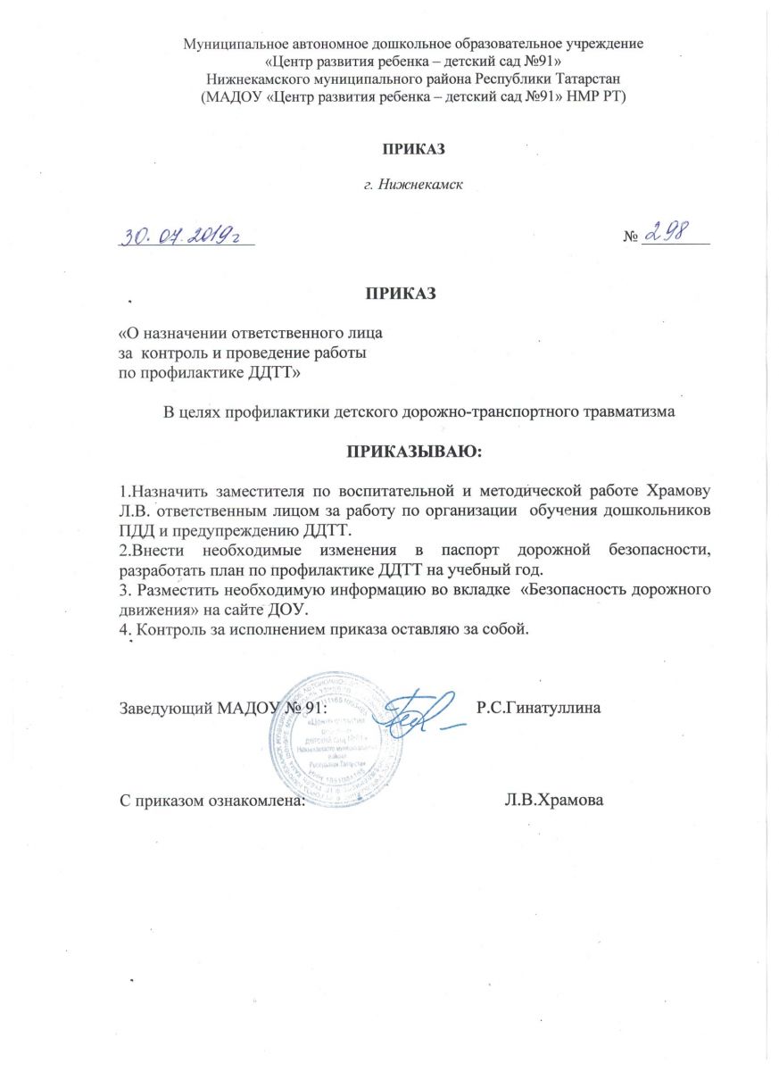 - Приказ "О назначении ответственного лица за контроль и проведение работы по профилактике ДДТТ"
