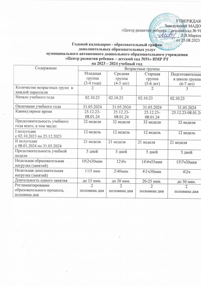 Годовой календарно-образовательный график дополнительных образовательных услуг на 2023-2024 учебный год