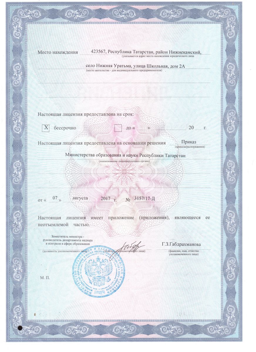 Адрес: 423568, Республика Татарстан, Нижнекамский район, с. Верхняя Уратьма, ул. Молодежная, д. 2