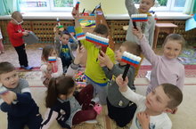 После беседы и просмотра видео о нашей стране, у которой 12 июня день рождения, воспитанники совместно с воспитателями решили украсить празднично окна в группе. -