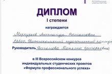 15 февраля 2022 года на базе ГАПОУ «Чистопольский многопрофильный колледж» состоялся III Всероссийский конкурс индивидуальных студенческих проектов «Формула профессионального успеха» для обучающихся профессиональных образовательных организаций. Поздравляем наших студентов с призовыми местами – Меркуьев Александр, 1 место (руководитель Диганова Т.Г.) и Величко Дарина, 2 место (руководитель Головинова Н.Е.)! Желаем им дальнейших успехов и впредь всегда ярко позиционировать себя в учёбе и жизни.