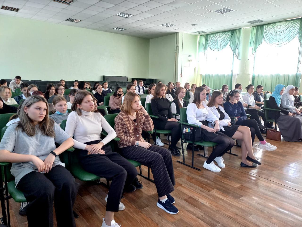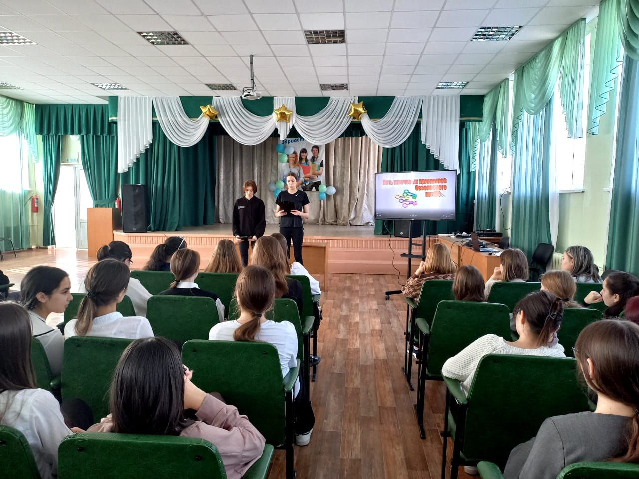 Перед фильмом активисты студенческого совета колледжа рассказали студентам об истории появления даты Всемирного дня здоровья, о важности физической активности и правильного питания.