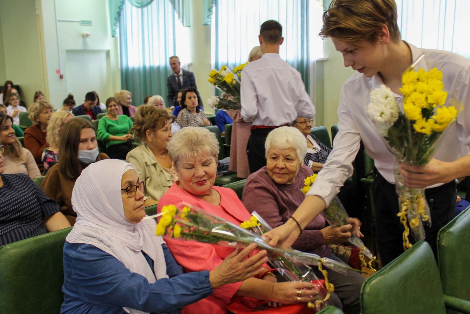 Трогательный момент праздничного мероприятия – цветы для ветеранов от молодого поколения.