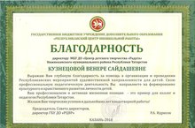 Благодарность РЦВР директору МБУ ДО ЦДТ "Радуга" Кузнецовой Венере Сайдашевне 13.06.2018