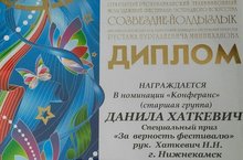 Обучающийся ЦДТ "Радуга" Данила Хаткевич, под руководством педагога Хаткевич Надежды Николаевны, завоевал спецприз "За верность фестивалю" и был награждён дипломом и памятным подарком.