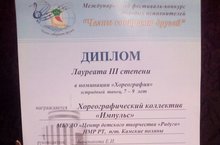 19 апреля в г.Набережные Челны прошёл Международный фестиваль-конкурс молодых исполнителей "Челны собирают друзей", на котором "Импульс" представил два танца "Спасатели" и "Будильник" в возрастных категориях от 4 до 6 лет и от 7 до 9 лет. По итогам наши звёздочки были награждены дипломом лауреата 3 степени и кубком за танец "Спасатели" и дипломом 1 степени за танец "Будильник". Поздравляем хореграфический коллектив "Импульс", под руководством Башмаковой Евгении Ивановны, и желаем дальнейших побед.