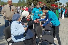 На торжественном митинге, посвящённому празднованию 78-ей годовщине Победы в Великой Отечественной войне, активистами ДРД среди тружеников тыла и детей войны была проведена акция "Георгиевская ленточка"