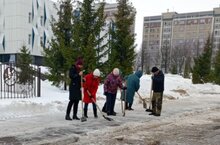 Сегодня всем коллективом расчищали тротуар от снега и льда.