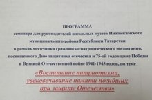 5 февраля на базе ГБУ "Нижнекамский детский дом" состоялся семинар для руководителей школьных музеев НМР РТ в рамках месячника гражданско-патриотического воспитания, посвящённый Дню защитника Отечества и 75-й годовщине Победы в Великой Отечественной войне 1941-1945 годов, на тему " Воспитание патриотизма, увековечивание памяти погибших при защите Отечества". Педагог-организатор нашего Центра Косс Татьяна Викторовна приняла активное участие в мероприятии.