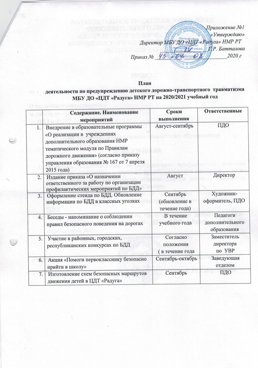 Приказ № 70 от 02 августа 2021 года "О назначении ответственного по организации мероприятий по ПДД и ДДТТ и план работы по профилактике ДДТТ на 2021-2022 учебный год.