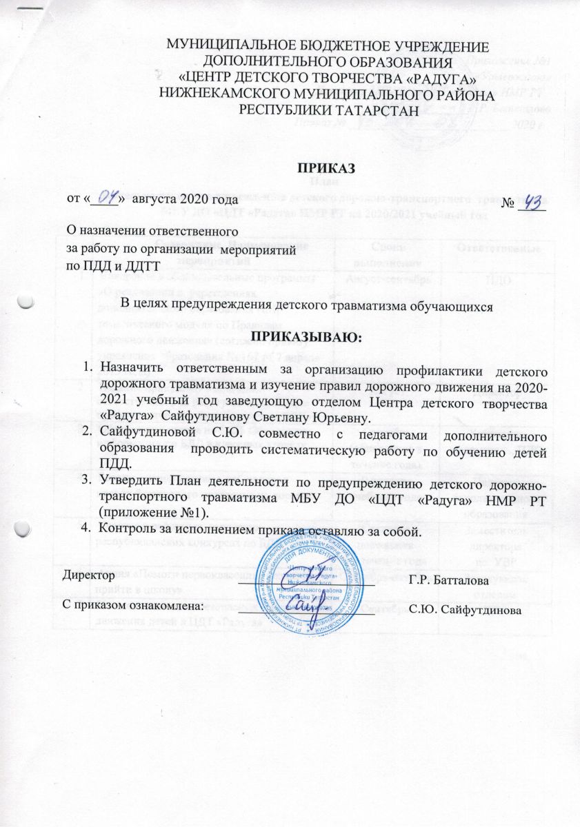 Приказ №43 от 4 августа 2020 года "О назначении ответственного за работу по организации мероприятий по ПДД и ДДТТ"