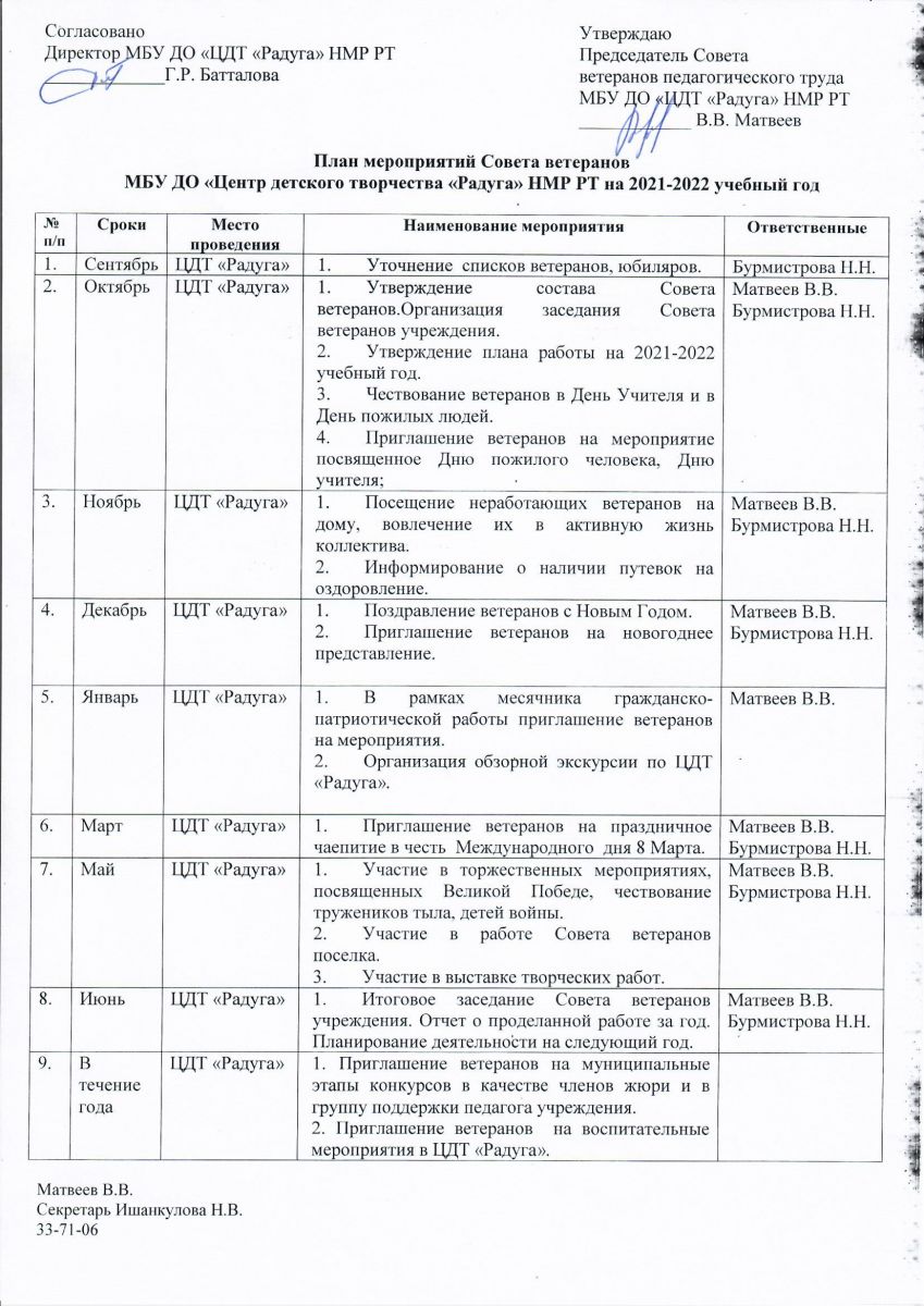 План мероприятий Совета ветеранов на 2021-2022 учебный год