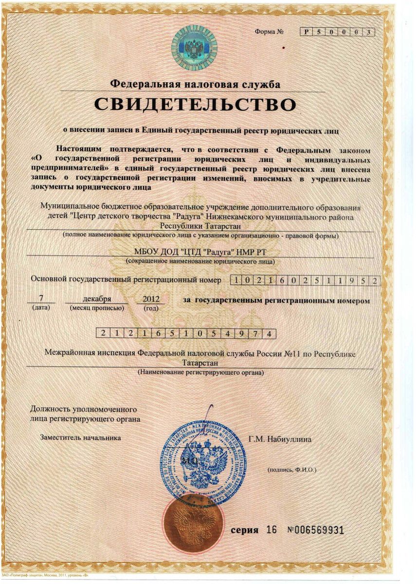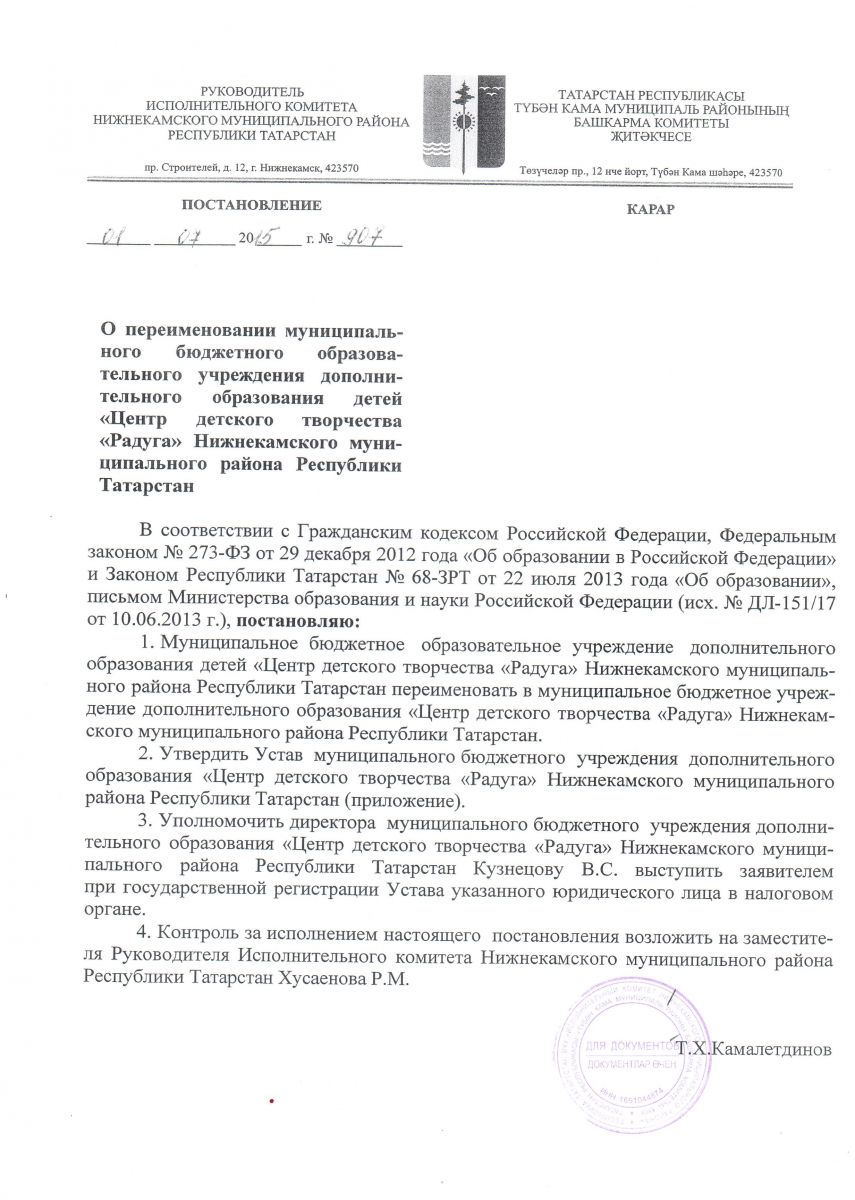 Постановление о переименовании МБОУ ДОД "ЦДТ "Радуга" НМР РТ