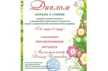 В конкурсе художественного и декоративно-прикладного творчества людей с ограниченными возможностями здоровья « От сердца к сердцу», организованного Управлением социальной защиты Министерства труда, занятости и социальной защиты Республики Татарстан в Нижнекамском муниципальном районе победителем стал ученик 8б класса Мулламухаметов Ильназ (педагог Сунгатуллина Л.В. Молодец, желаем дальнейших творческих успехов!