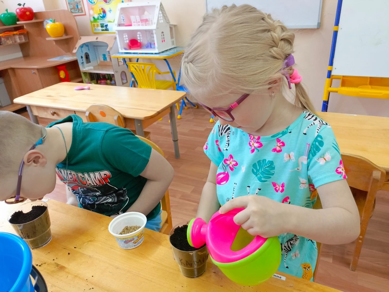Дети активно участвовали в посадке огорода посадили лук, посеяли овёс и разнообразные цветы. Ребята с нетерпением ждут и наблюдают, когда появится первый росток. Совместными усилиями мы создаем красивый и вкусный урожай на окне. -