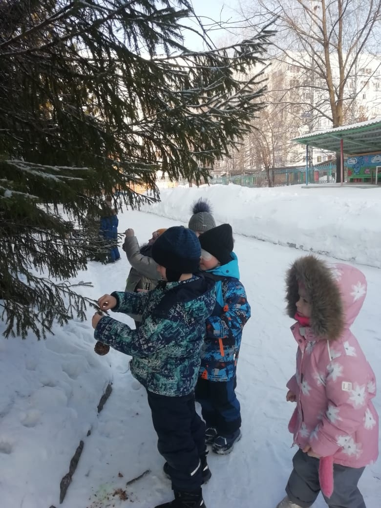 Готовые кормушки дети развесели на деревьях , что бы птицы могли кушать.