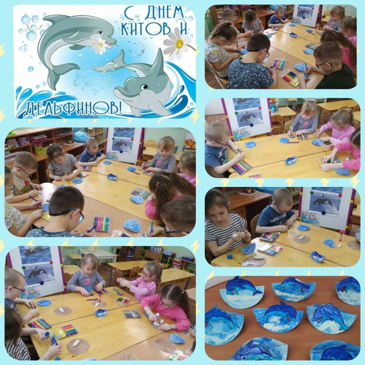В старших группах №6 и №1 были проведены мероприятия по изучению морских млекопитающих и причин, по которым грозит им смертельная опасность. Велись экологические беседы с просиотром презентаций, а также, искали на карте места обитания морских гигантов; читали художественные произведения о морских млекопитающих, выполняли аппликации, рисовали дельфинов и китов. Воспитанники познакомились с многими обитателями морских просторов.