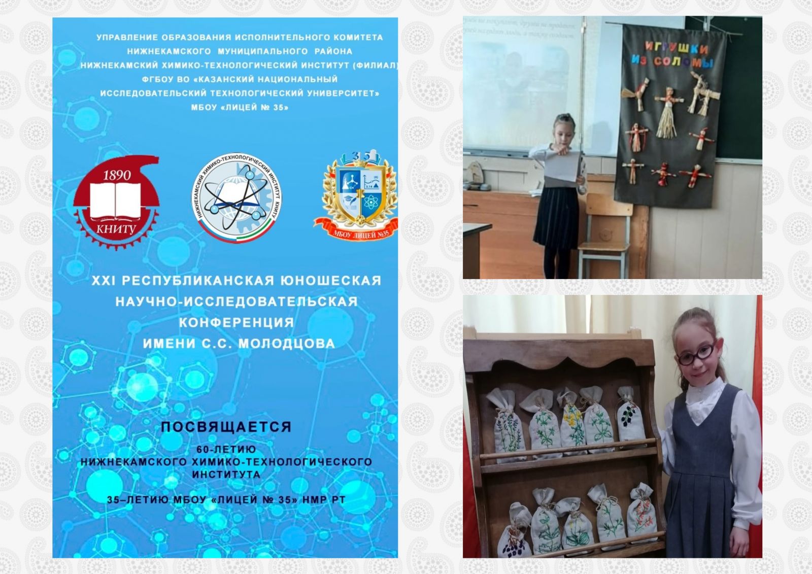Сегодня в лицее N35 состоялась XXI Республиканская юношеская научно-исследовательская конференция имени С.С. Молодцова. Ученица второго класса Артамонова Ралина и ученица третьего класса Поздеева Дарина представили вниманию жюри свои работы в номинации "Прикладное искусство".