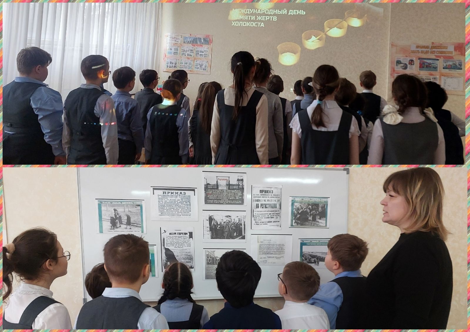 С 16 по 31 января по всей территории Российской Федерации состоялась ежегодная, XI «Неделя памяти жертв Холокоста», в рамках которой в нашей школе прошёл цикл мемориальных и просветительских мероприятий, приуроченных к Международному дню памяти жертв Холокоста и годовщине освобождения Красной Армией лагеря смерти «Аушвиц» (Освенцим): оформление стенда «Документы о холокосте – свидетельства трагедии», классные часы "27 января - день Памяти жертв Холокоста", просмотр документально-хроникального фильма «Холокост. Трагедия народа».