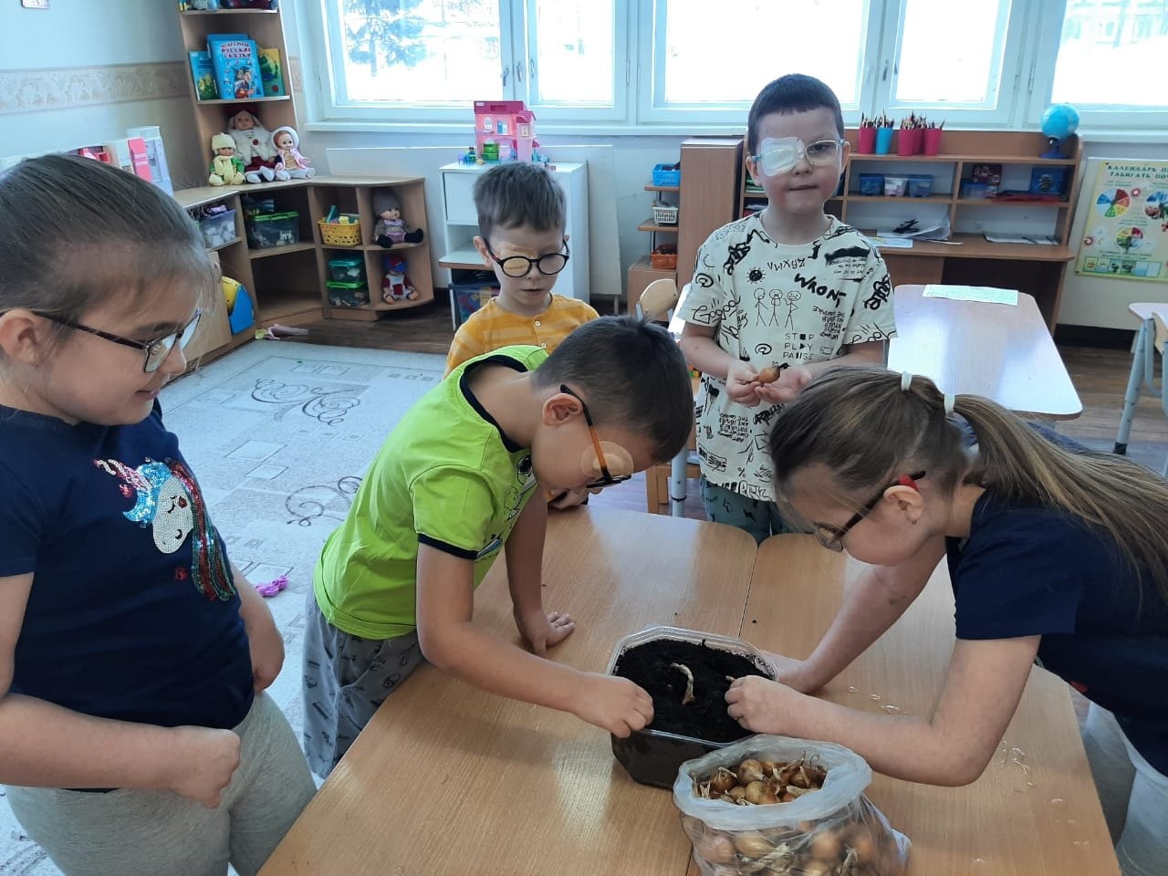 Воспитанники подготовительной группы №1 вместе с воспитателями решили вырастить зеленые перья лука.