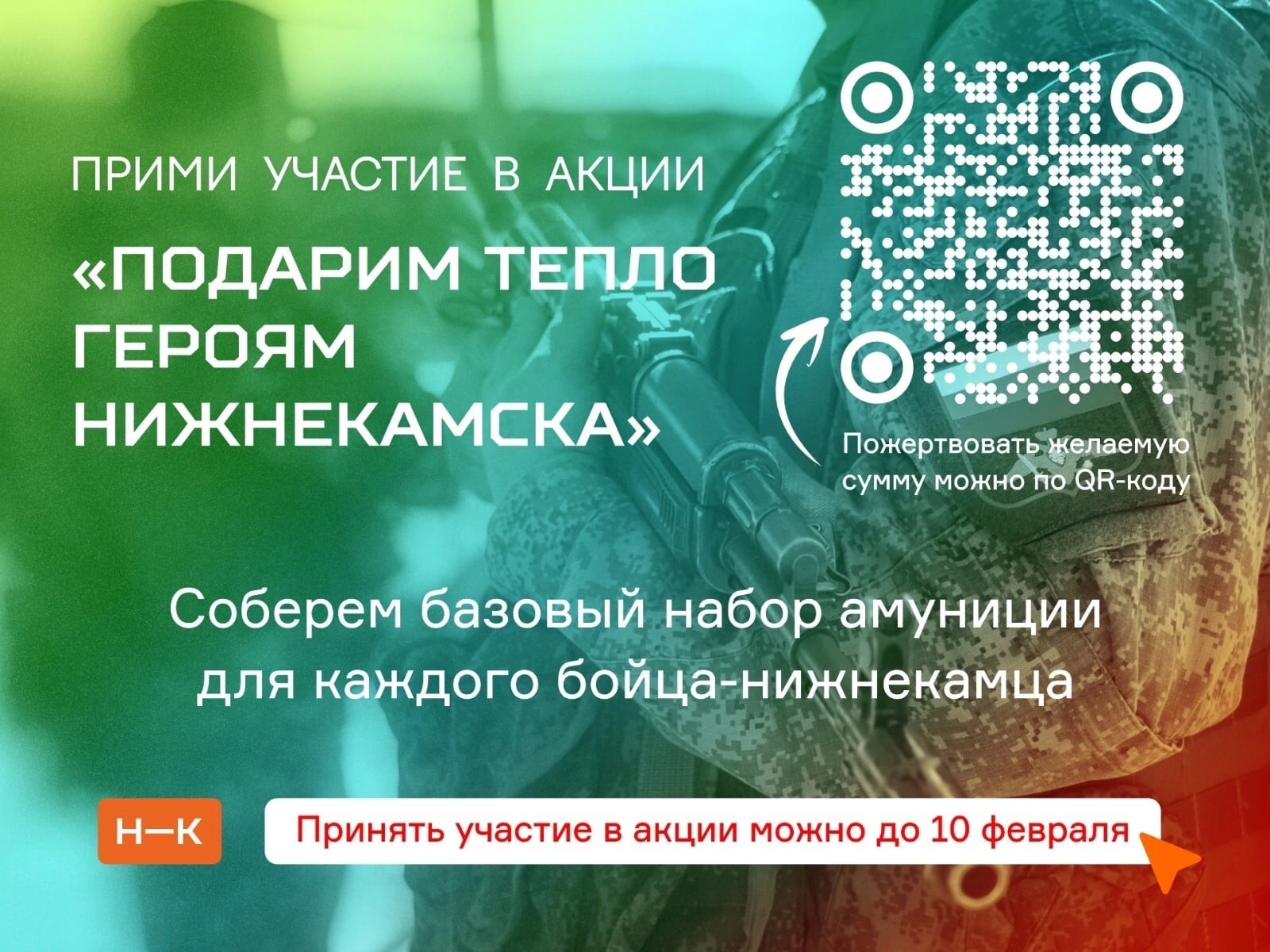 Ко Дню защитника Отечества Нижнекамск запустил благотворительную акцию в поддержку наших военнослужащих. Планируется подготовить 1 000 базовых наборов амуниции (столько бойцов из Нижнекамска стоят на защите Родины в зоне СВО), где будут собраны предметы самой первой необходимости. Стоимость одного оценивается в 15 тысяч рублей. Пожертвовать желаемую сумму на счёт акции можно с помощью перехода по QR-коду. В каждый комплект будет входить комплект термобелья, тактические перчатки, наколенники, балаклавы, аптечка, аккумуляторы, фонарики, саперные лопаты и другие вещи.Принять участие в акции можно до 10 февраля.Ссылка для осуществления перевода на сайте волонтерского центра -