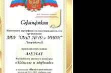 Нашей школе присвоено звание ЛАУРЕАТ Российского заочного конкурса "Познание и творчество" в номинации "Начальная школа" по итогам 2010 - 2011 учебного года.
