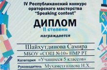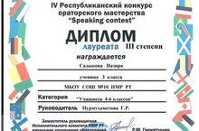 Шайхутдинова Самира ученица 5Б класса стала обладателем диплома II степени IV Республиканского конкурса ораторского мастерства «Speaking contest».