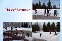 1 апреля ученики школы приняли участие в субботнике. Они раскидывали снег во дворе школы.