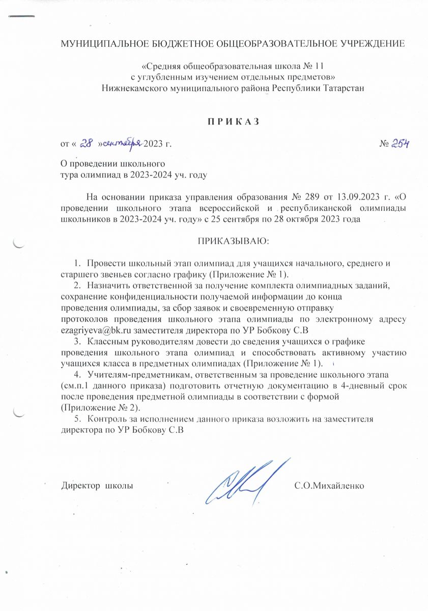 Приказ "О проведении школьного этапа предметной олимпиадыв 2023-2024 учебном году"