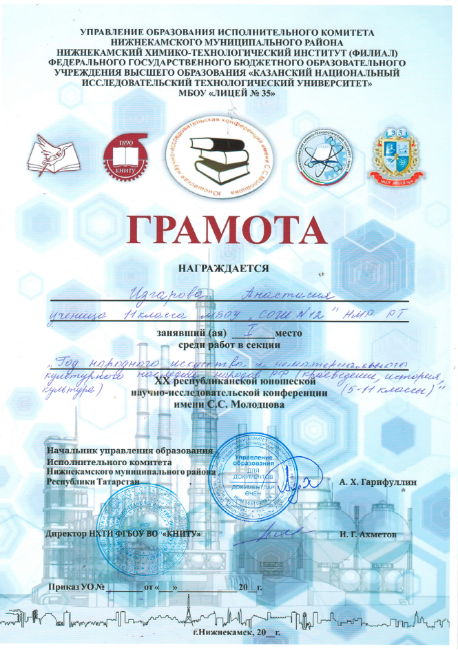 Муниципальное бюджетное общеобразовательное учреждение «Средняя общеобразовательная школа №12 с углубленным изучением отдельных предметов» Нижнекамского муниципального района Республики/ Татарстан Республикасы Түбән Кама муниципаль районының «Аерым фәннәрне тирәнтен өйрәнүле 12 нче гомуми урта белем бирү мәктәбе» муниципаль бюджет гомуми белем бирү учреждениесе