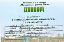 В рамках профориентационной работы классный руководитель 6а класса Галиева Г.Ф. подготовила учащихся для конкурса "Папа, мама,я-рабочая семья". В муниципальном конкурсе победила семья Кулаковых.Кулаков Александр Сергеевич-активный участник Совета отцов школы представлял на конкурсе свою профессию - сборщик автопокрышек. Его поддержала Кулакова Полина.Она выступила с презентацией и рассказала о профессии своего папы.Поздравляем семью с Дипломом 3 степени! 28.11.2016