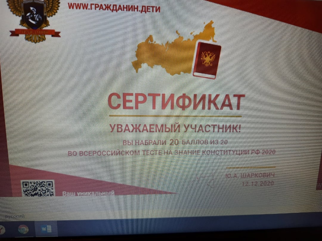 12 декабря родители и обучающиеся 7а класса прошли Всероссийский тест на знание Конституции РФ 2020.