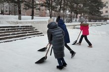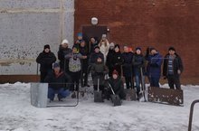 Вот такой большой компанией: учителя, родители и дети. Ученики 7-х классов выходят на уборку снега на территории любимой школы -