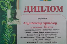 Асулбаев Артем ученик 1 “ В “ класса награжден дипломом за участие в муниципальном конкурсе чтецов « Яттан сөйлә Тукай шигырьләрен,- шул булыр иң зур бүләгең” посвященного 129 летию Г.Тукая и 70- летию Победы.