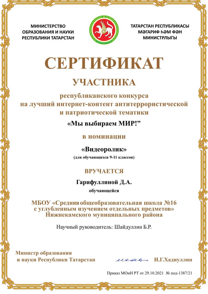 Поздравляем ученицу 11 класса Гарифуллину Динару с успешным выступлением в республикансом конкурсе на лучший интернет-контент антитеррористической и патриотической тематике "Мы выбираем МИР!" В номинации "Видеоролик". Научный руководитель преподаватель-организатор ОБЖ Шайдуллин Б.Р.