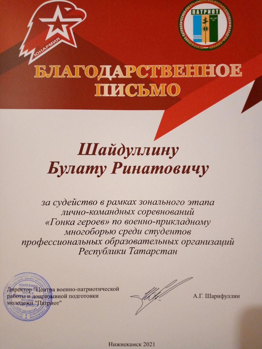 Сегодня состоялось торжественное награждение преподавателей образовательных организаций за справедливое судейство зонального этапа соревнований "Гонка героев" по военно-прикладному многоборью. Преподавателю-организатору ОБЖ нашей школы Шайдуллину Б.Р. было вручено благодарственное письмо от Центра военно-патриотической работы и допризывной подготовки молодежи "Патриот"