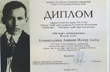 работ «В реликвиях душа Тукая» Калимуллину Амилию, ученицу 1Г класса, с призовым 3 местом! Руководитель: Жуковская Руфина Касимовна. Конкурс проводился в рамках года Родных языков и народного единства.