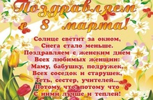 Дорогие учителя! Ваша профессия очень сложная, но вы продолжаете трудиться ради нас. Вы не только хороший педагог, но и красивая, добрая, понимающая женщина, которая относится к каждому ученику, как к своему ребенку. И за то что вы часто уделяете нам время больше, чем своей семье, мы благодарим от всего сердца. Примите наши поздравления с 8 Марта. Пусть этот день станет новым витком в вашей жизни, где найдется место только для счастья. Именно этого вы заслуживаете!